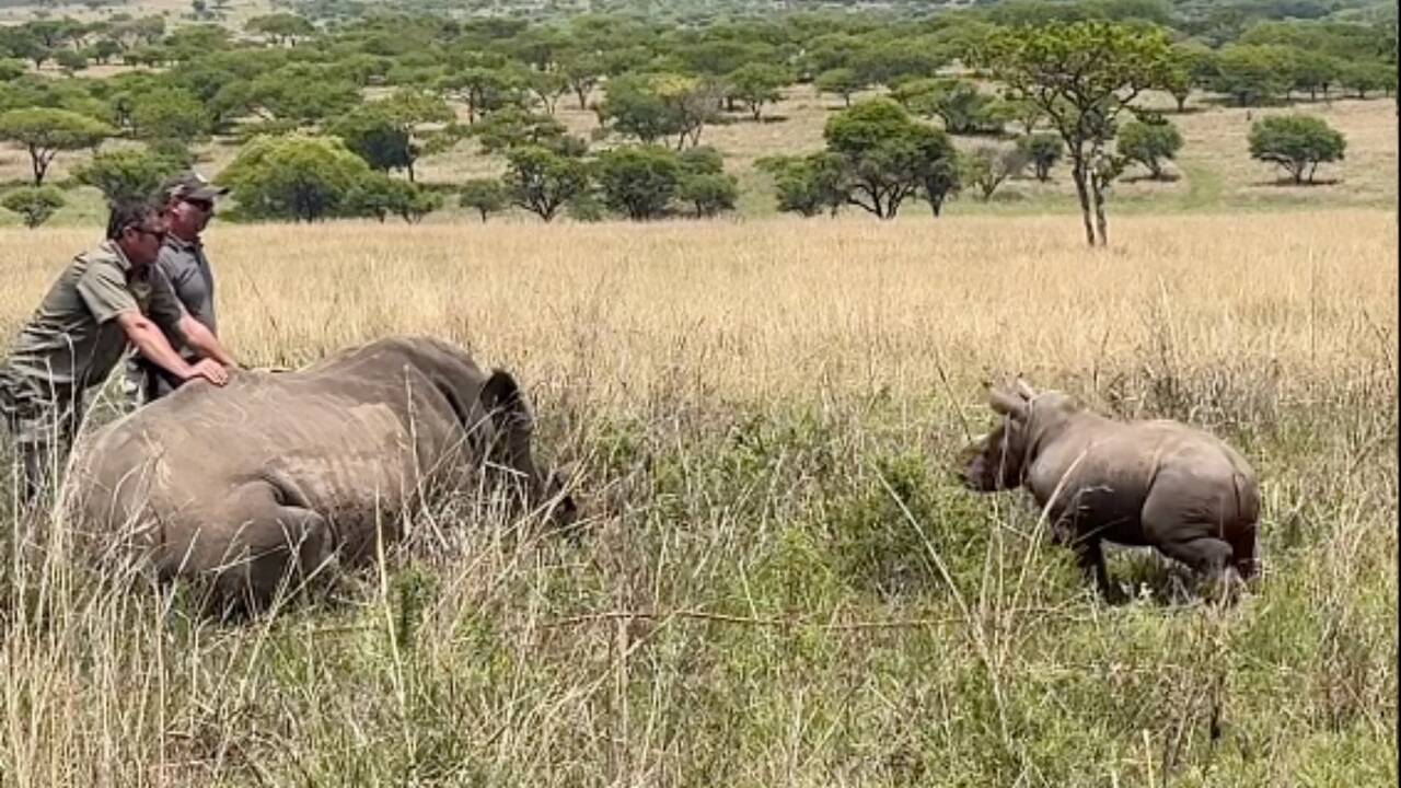 Tiny Rhino Calf Stands Its Ground As Mom Is Deh... tes