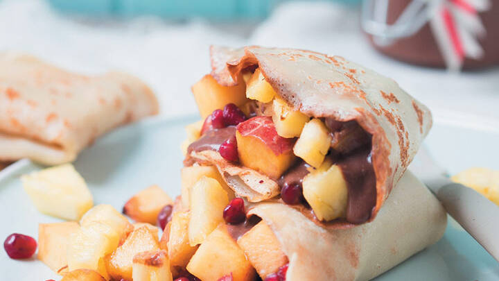Vegan pancakes with fruit and chocolate sauce