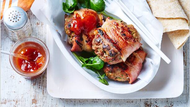Bacon-wrapped frikkadels with tomato chutney