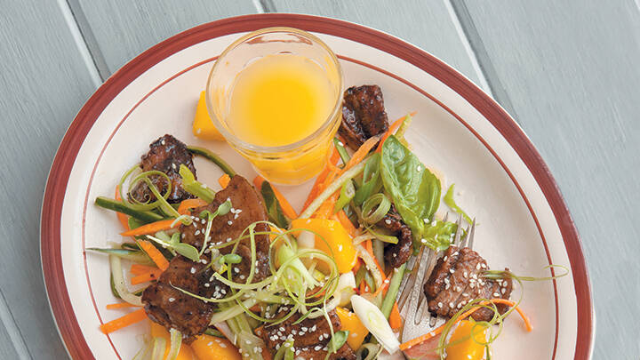 Sweet and sticky Thai stir-fried pork belly and mango salad