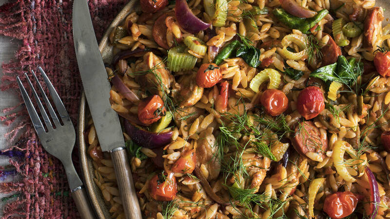 Chicken chorizo, fennel roasted tomato risoni