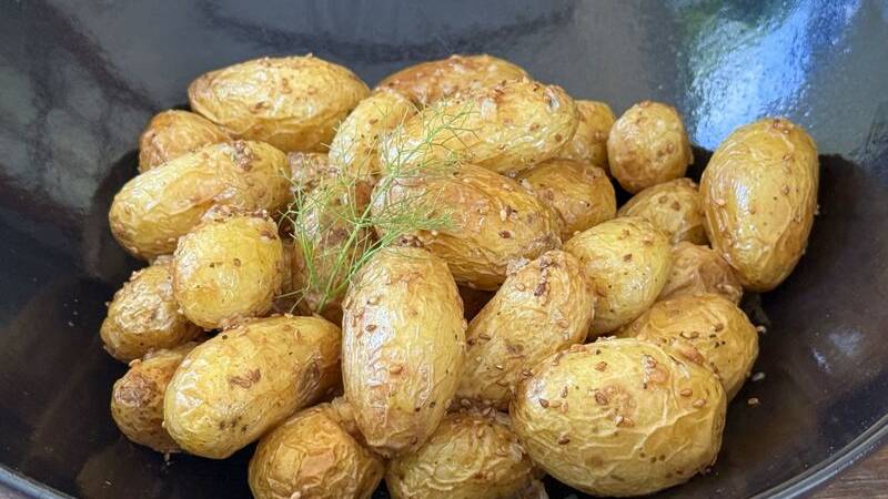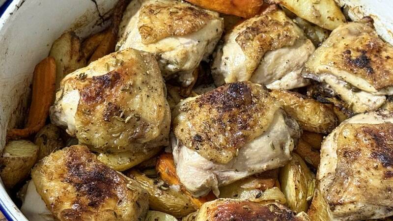 Baked chicken thighs and vegetables with flavours of anise