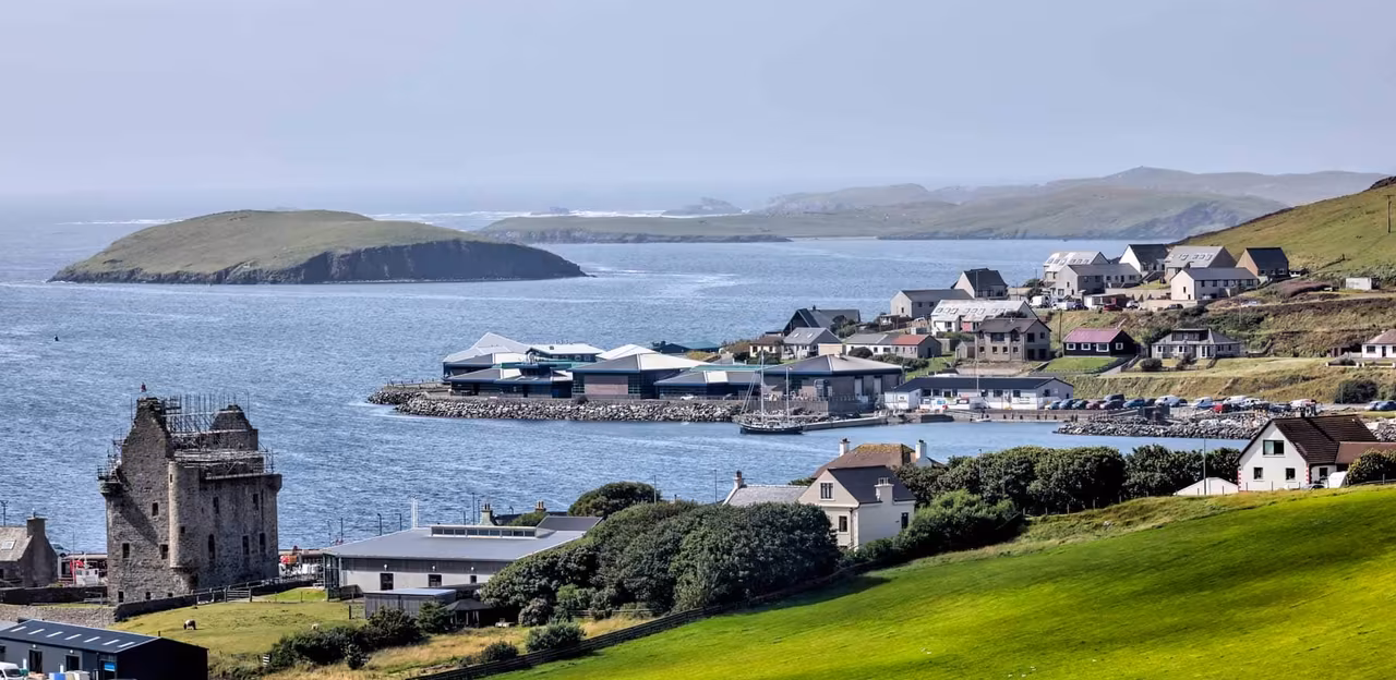 The Viking Sky glides slowly into the harbor at Lerwick, and I’m standing on our balcony watching the Shetland Islands come into view. Stone buildings line the waterfront in tidy rows. Fishing boats bob alongside weathered docks. A pilot boat cuts a white wake through the steel-grey water, guiding us in.