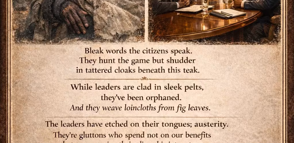 The poem condemns leaders who preach austerity while indulging in wealth and serving oligarchic interests.