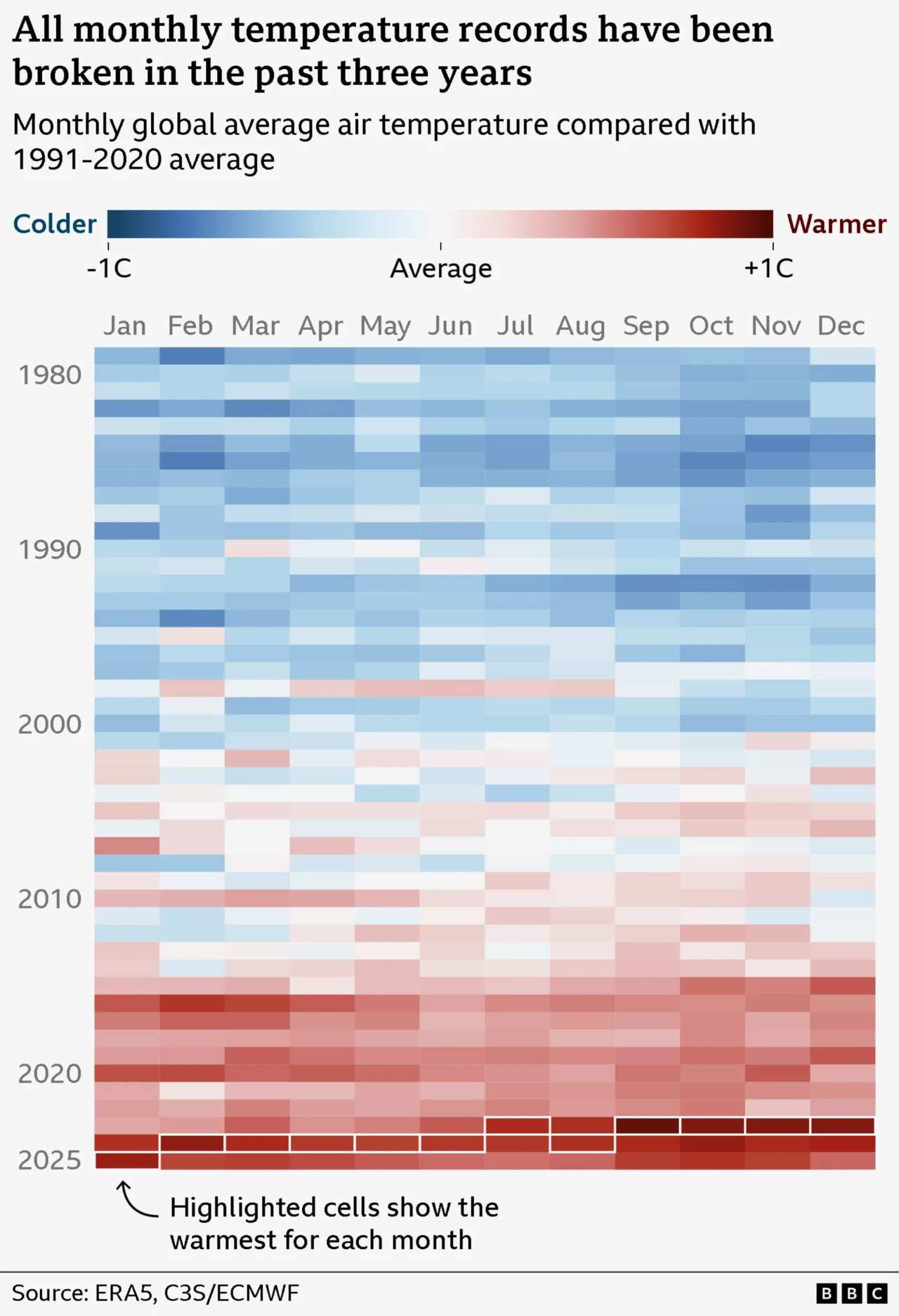 The last three years have seen global temperature records broken by significant margins. As the chart below shows, new records for each month of the year have been set since 2023.
