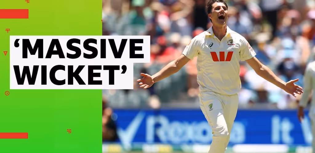 Pat Cummins takes his second wicket of the innings as Joe Root is caught behind for 19 as England fall to 71-4 in their first innings, 300 runs behind Australia's 371, as the home side take control on day two of the third Ashes Test in Adelaide.