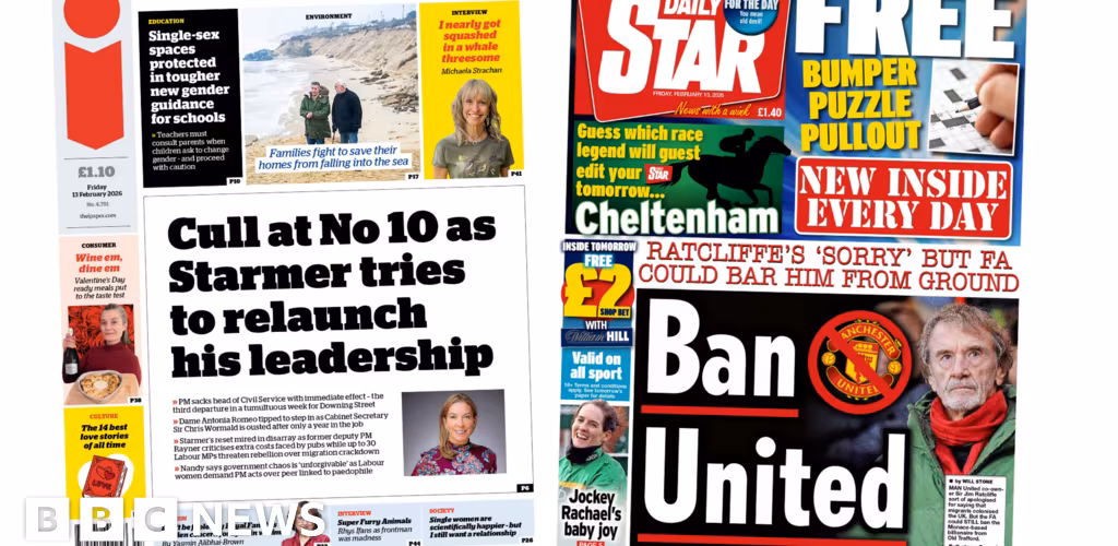'Cull at No 10' and 'Ban United' BBC | 13.02.2026 08:52 Chief civil servant Sir Chris Wormauld and Manchester United co-owner Sir Jim Ratcliffe dominate Friday's papers.Read more RELATED STORIES Diablo 2 gets loot filters, stash tabs, and built-in holy grail tracker... Tech Meta turned Threads algorithm complaints into an official feature Tech HP’s laptop subscriptions are a great deal — for HP Tech Dubai airport pushes limits with record 95million passengers Travel Why I wish I hadn’t bought my Samsung OLED TV Tech American Airlines Plans Venezuela Flights Despite ‘Do Not Travel’... Travel Your weekend guide to SA’s best events and experiences Travel Who made the cut? January’s best-selling Chinese vehicles are… Motor Major Cruise Line Stops All Operations Ahead of 2026 Season Travel Beau Monde Traveller launches South African edition Travel The town that launched a global self-care industry Travel Mercedes-Benz GLC 200 in SA: price and specs Motor