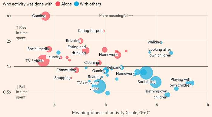 The chart on the right: A model was built to predict the outcome. People were asked to rate each activity based on their sense of purpose and happiness while doing it. The activities were part of Americans’ routines in 2010 and 2023.