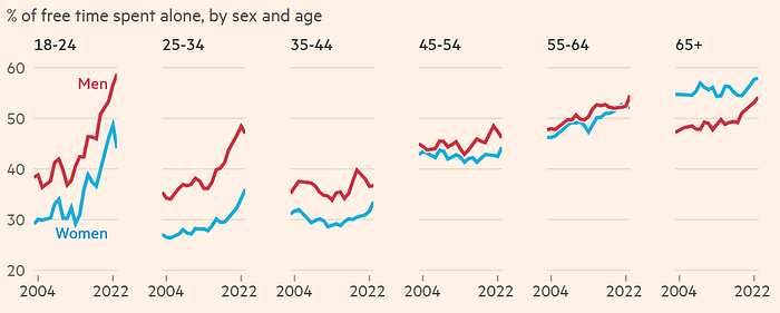 In recent years, many sources have begun to converge in the same direction. Time-use analyses reveal a sustained decline in in-person socialization. And mental health problems are growing precisely in the same age groups where isolation is increasing — not among older adults.