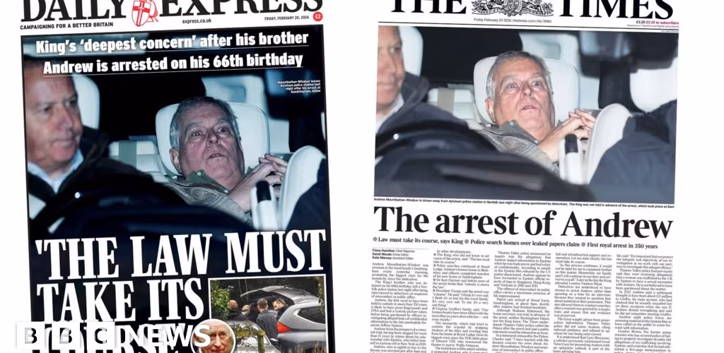 The image of Andrew Mountbatten-Windsor after his release from police custody following his arrest dominated today's paper.