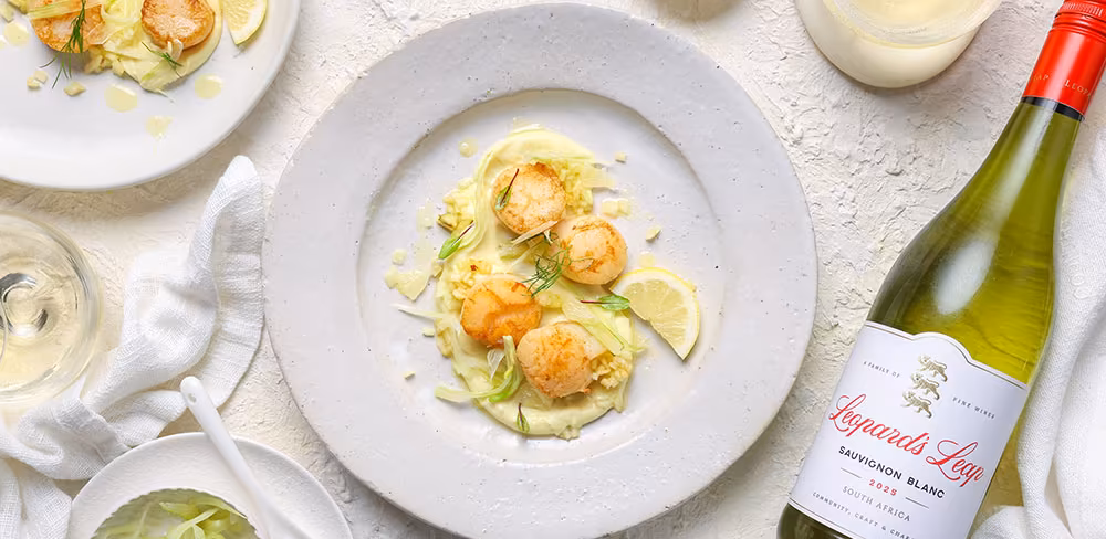 Sweet scallops served on a silky cauliflower purée with crisp fennel and apple salad garnish.