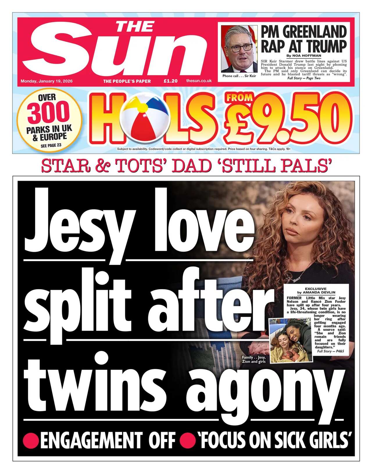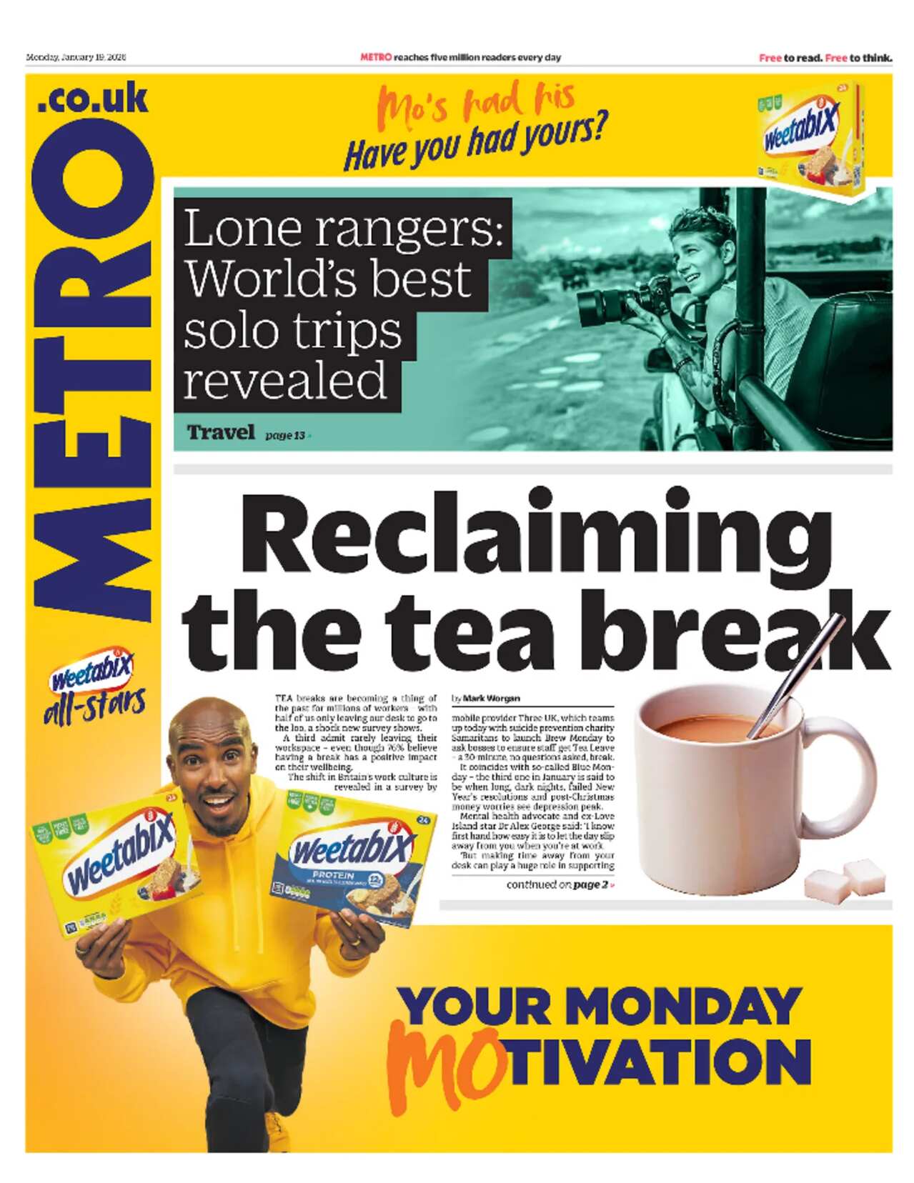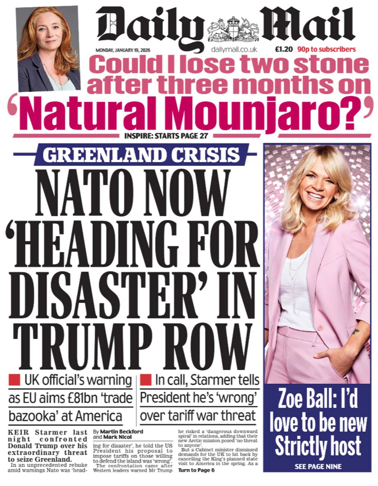 The Financial Times follows with details that the possible retaliatory tariffs are being drawn up to give European leaders leverage in crucial meetings with the US president at the World Economic Forum in Davos this week."Europe delivers a warning to Trump" echoes the Independent. Elsewhere, the paper fills its picture slot with a fist-pumping Emma Raducanu after she began her campaign at the Australian Open with a decisive win over Thailand's Mananchaya Sawangkaew.Raducanu is a popular picture choice on many of the front pages and the Daily Express accompanies its image of her celebrating victory with the headline "Smiling Emma wins after slow start Down Under". Its lead story, like most others, is about the tariffs and it focuses on Europe's warning that Trump's threat "will rip Nato apart". It also quotes Russia's response to the row, hailing it as a "collapse of the transatlantic union"."Nato now 'heading for disaster' in Trump row" is the Daily Mail's take, as the paper says Western leaders are warning the US president that his threat risked "a dangerous downward spiral" in relations.The i Paper calls row the "biggest crisis" to hit the Nato alliance in decades and its "greatest threat".The Daily Mirror's headline sums up the fallout as "Trump's Greenland madness" and spotlights Lib Dems leader Sir Ed Davey urging the King to axe his planned US state visit in April, saying the UK "must not be a doormat for an extortionist".In other news, a new survey reveals tea breaks are becoming a thing of the past for millions of workers, with only half leaving their desk to go to the loo and a third rarely leaving their workspace, Metro reports.Need an antidote for Blue Monday, measured as the day with the lowest public mood of the year? Well the Daily Star gives us news that Bez, whom it joyfully describes as a "dancing maracas star", will be heading back on the road in March as part of a 35-year anniversary tour with the rock band Happy Mondays. "Don't worry... Bez happy" is the headline as the paper pledges to "cheer you up every day of the week".Finally, the Sun reports on the news that former Little Mix star Jesy Nelson and her fiancé Zion Foster have split up after four years together.