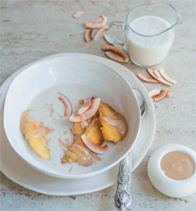 Fried bananas in a vanilla-coconut broth with a nut-butter-and-honey sauce