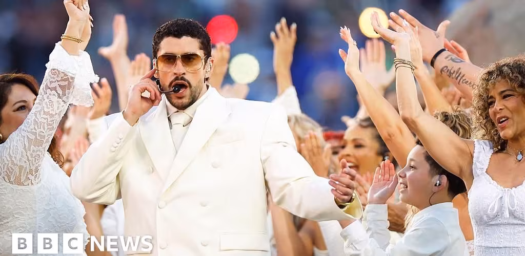 Puerto Rican artist Bad Bunny makes history with his entirely Spanish set on the sporting world's biggest stage.