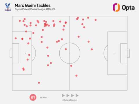 Although his aerial ability is not his biggest attribute, Guehi competes strongly in ground duels towards the left side of the pitch.