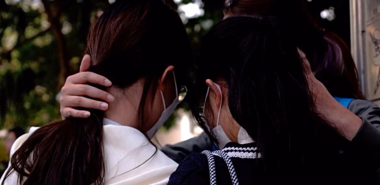 Survivors cling to each other as debris falls from smouldering Hong Kong buildings