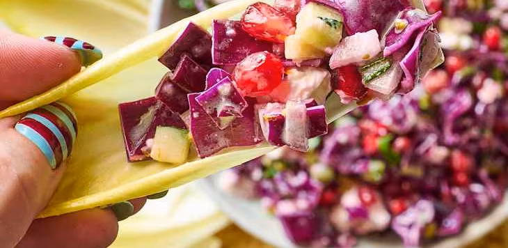 It started a few years back when I saw Baked by Melissa make a finely chopped green goddess salad and proceed to eat it with tortilla chips. I immediately thought, “Oh, she gets it.” You get all the benefits of a chopped salad — the even flavor distribution, the textural variety — but you get to eat it like a dip. You can make a scoop salad out of anything by simply cutting your ingredients up into small pieces, but this one is perfect for winter. Vibrant red cabbage, pomegranate jewels, creamy feta cheese, and crushed buttery pistachios all tossed in a fresh orange vinaigrette will make people go back for bite after bite. I like to serve it with tortilla chips and endive leaves, but it still stands on its own as a fork-worthy side. It’s just more fun to scoop!