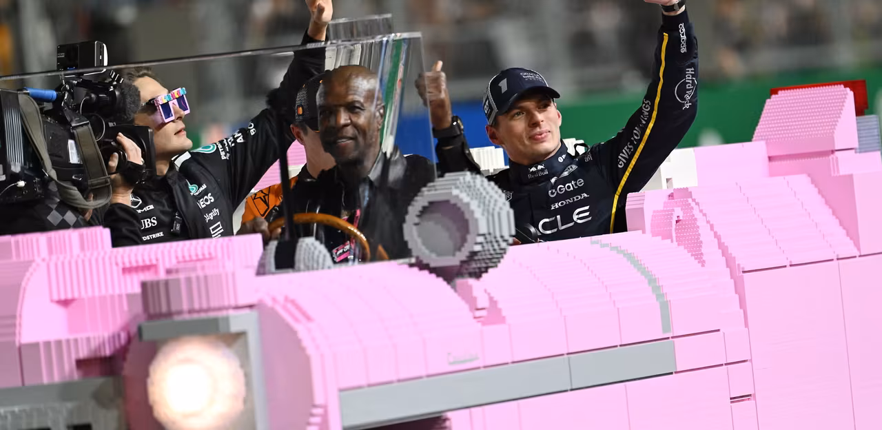 Max Verstappen, Lando Norris and George Russell enjoyed an entertaining victory lap with Terry Crews in a full-size LEGO Cadillac after the Las Vegas Grand Prix.