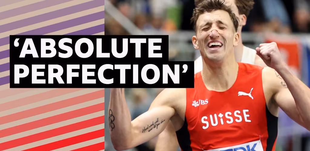 Switzerland's Simon Ehammer records a time of two minutes 41.04 seconds in the men's 1,000m to reach 6670 points in the men's heptathlon and beat Ashton Eaton's previous world record of 6645 at the World Indoor Athletics Championships in Poland.