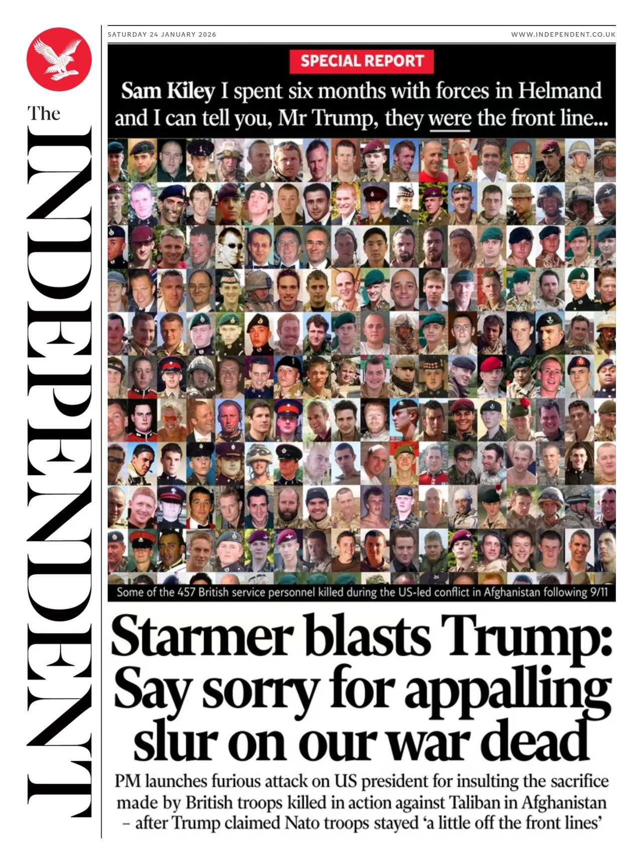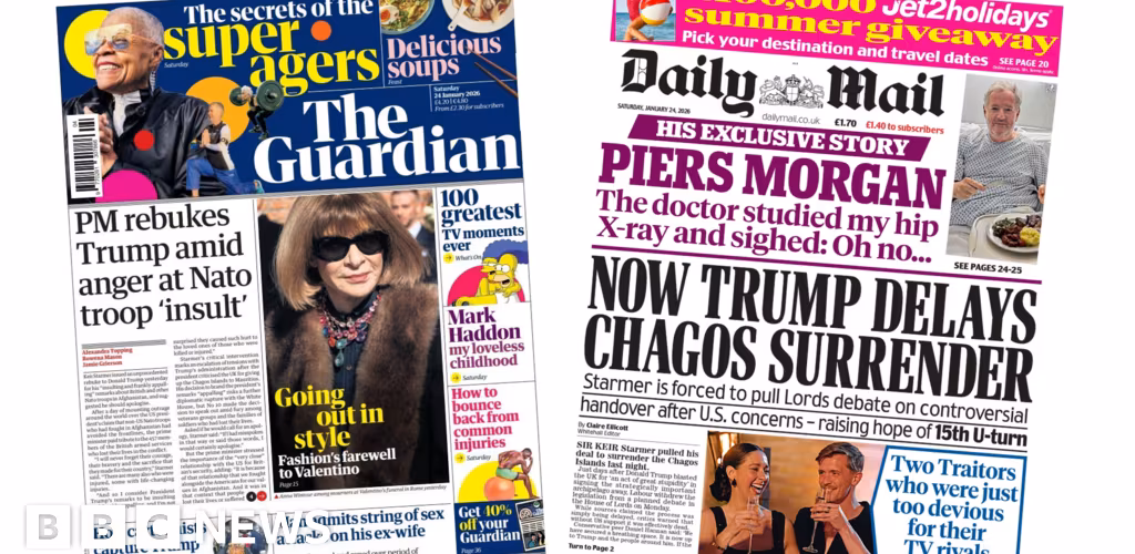 The Daily Mirror demands an apology from Trump with "say sorry" for the headline after his "insult to fallen Brit heroes". Both injured veterans and Prince Harry "slam" the president, it says.The Independent echoes the Miror with Starmer's call for Trump to apologise for the "appalling slur on our war dead". The paper honours the personnel killed in the fighting with photos of some of the 457.The Daily Express calls Donald Trump a "bloody cheek" after his Nato comments. "Donald, there are 457 tragic reasons why you are so wrong", it says with its front splashed with a convoy of hearses that carried the coffins of British troops killed in Afghanistan."Now Trump delays Chagos surrender" headlines the Daily Mail. The legislation, which was due to be debated in the House of Lords on Monday, would see the archipelago handed to Mauritius, with the UK leasing a military base for £101m a year. But the debate has been pulled "just days" after the president "blasted the UK for 'an act of great stupidity'," it writes, saying the move raises "hope of 15th U-turn".The Daily Telegraph says UK Prime Minister Sir Keir Starmer has been "forced" to pull the Chagos Islands bill following "US backlash over the deal". Also on its front, "genetic tests for cancer coming on the NHS".The Sun has the latest on Brooklyn Beckham and his famous family. In an exclusive, the paper says his wife Nicola Peltz told him "it's me or her, you can't have both" after "feeling upstaged by his mum Victoria at their wedding".Young people with "normal" mental health conditions are being "written off", the author of a review into Neets - young people not in education, employment or training - has said. Former Labour cabinet minister Alan Milburn told the Times the UK is facing a "lost generation" of 16-24 year olds as a result.