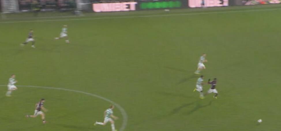 The American centre-back was initially shown a yellow card for bringing down Pierre Landry Kabore as the Hearts striker raced in behind the Celtic defence.