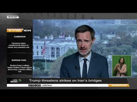 Trump threatens strikes on Iran's bridges, power plants SABC News Video | 04.04.2026 13:36 US President Donald Trump has threatened to target Iran's bridges and electric power plants.Read more RELATED STORIES Bulls make big call for Glasgow clash Rugby Crusaders give stadium fitting farewell Rugby Quarter-final spots at stake as SA teams return to Europe Rugby We must make rugby a safer game to play - Irwin Rugby Jones excited for La Rochelle's trip to Newcastle Rugby Farrell backed for return against Boks Rugby Wales great Faletau to miss rest of Cardiff's season Rugby Sharks Switch Focus to Connach Clash in EPCR Challenge Cup Rugby Pirates coach Paver banned after slapping player Rugby Welsh district wants EGM to be cancelled Rugby Her Salon Gives Women On Drugs A Chance To Makeover Their Lives Stories from South Africa Former Stormer in doubt for heavyweight clash Rugby