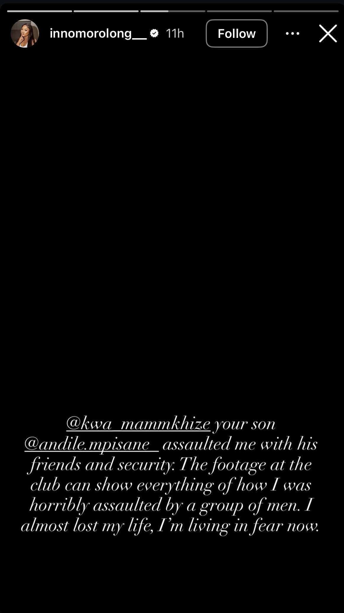 She also tagged Mpisane’s mother in another message and repeated her allegations. Morolong wrote, “@kwa mammkhize your son @andile.mpisane assaulted me with his friends and security: The footage at the club can show everything of how I was horribly assaulted by a group of men. I almost lost my life, I’m living in fear now.”