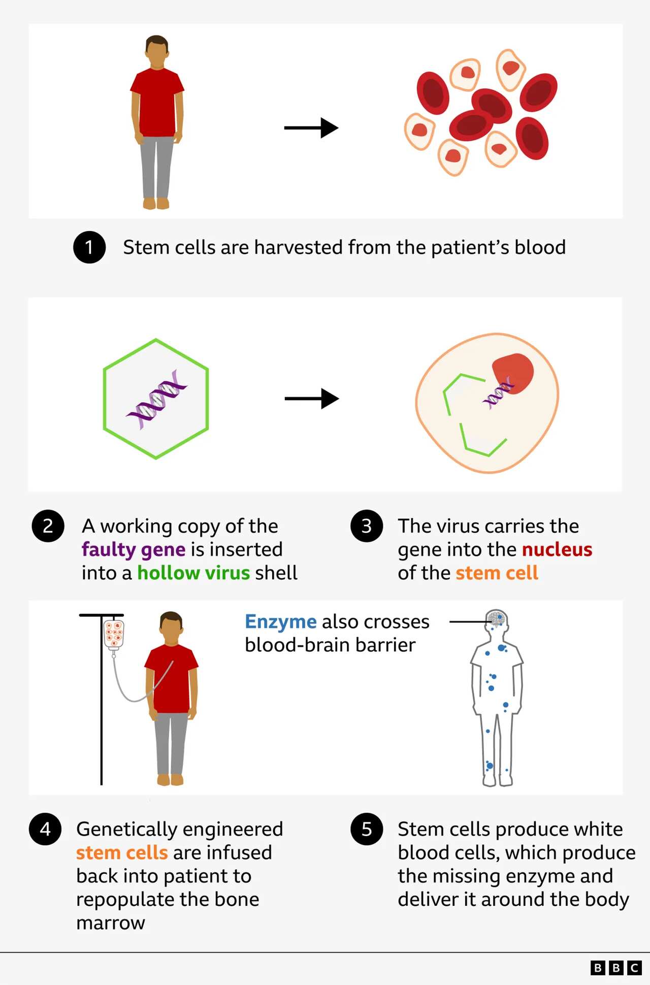Dr Karen Buckland, from the Cell and Gene Therapy Service at GOSH, explains: "We use the machinery from the virus to insert a working copy of the faulty gene into each of the stem cells.