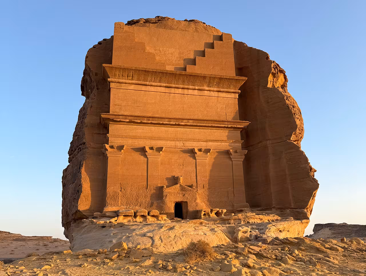 kingdom. Nestled amid soaring wind-formed limestone cliffs, the verdant date-palm oasis was once a stop-over for muslim pilgrims heading south toward the holy cities and before that, incense traders from southern Arabia traveling north to the Fertile Crescent. The well-preserved adobe-style settlement here dates back 900 years. The iconic Hegra tombs nearby—erected by the same civilizations as Petra—are at least 2100 years old.