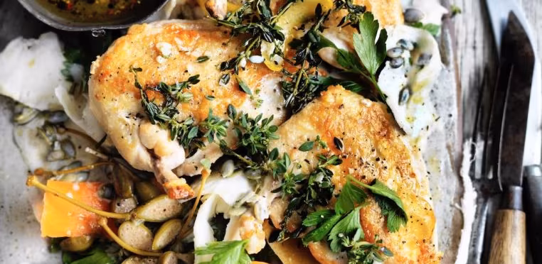 Bright, zesty and full of Mediterranean flair, this Lemon Thyme Chicken with Caperberry Salsa pairs succulent roasted chicken breasts with vibrant ribbons of celeriac and carrot salad topped with a tangy caperberry salsa. Fresh thyme, lemon zest and peppery caperberries bring bold flavour to every bite, while toasted pumpkin seeds and creamy yoghurt add delightful texture. A perfect gluten-free main that’s elegant enough for guests yet easy enough for a weeknight.