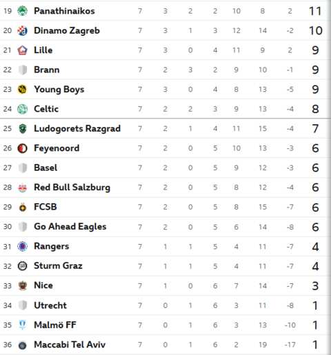 Celtic were 2-0 ahead against Bologna, but down to 10 men, before the Italians fought back to earn a 2-2 draw. However, the point leaves Martin O'Neil's side on eight points and occupying 24th spot, the last of the play-off places.