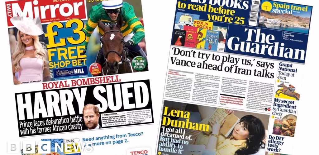 News of the Duke of Sussex being sued for defamation by a charity he co-founded dominates several of Saturday's front pages.