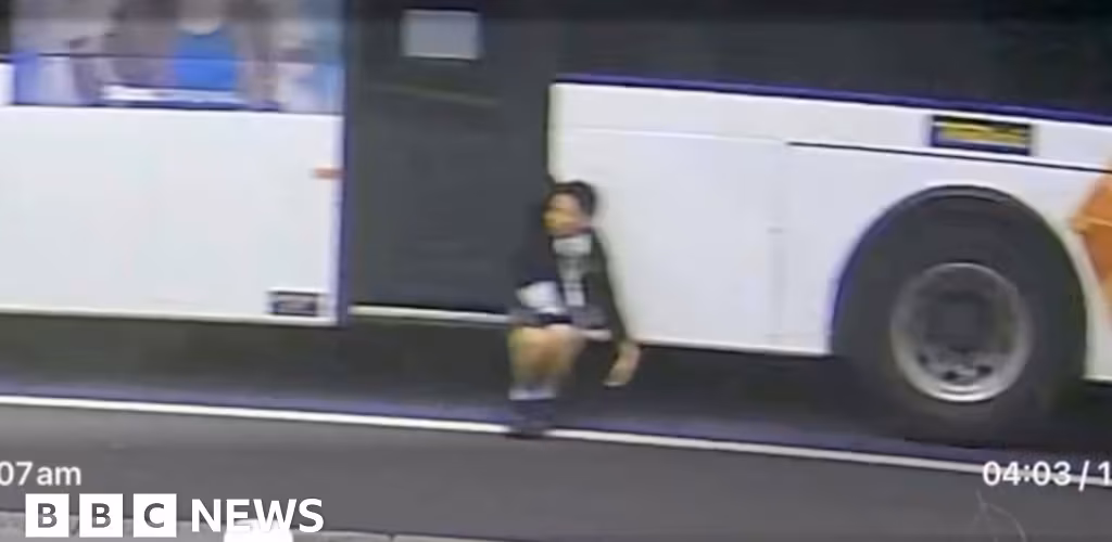 CCTV footage shows a boy dangling from the rear doors of a moving bus in Melbourne, Australia.