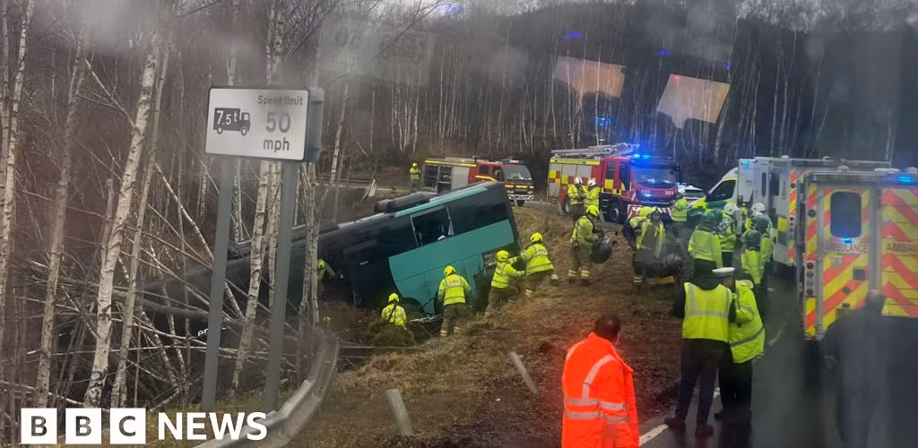 Two in hospital after bus crashes down embankment on A9