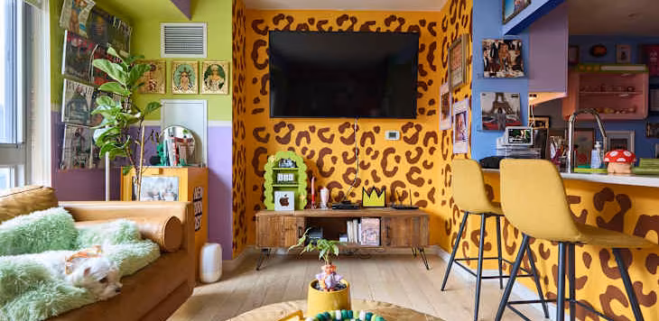 From a disco bathroom to a lavender kitchen and DIY leopard-print walls, Devin Downs transformed his plain rental with color, nostalgia, and personality — he calls it a “pop culture palace!”