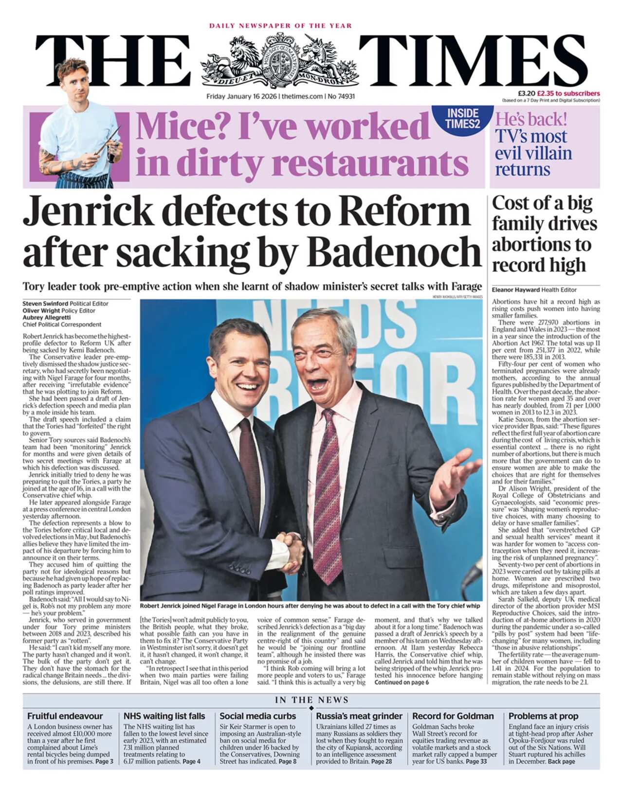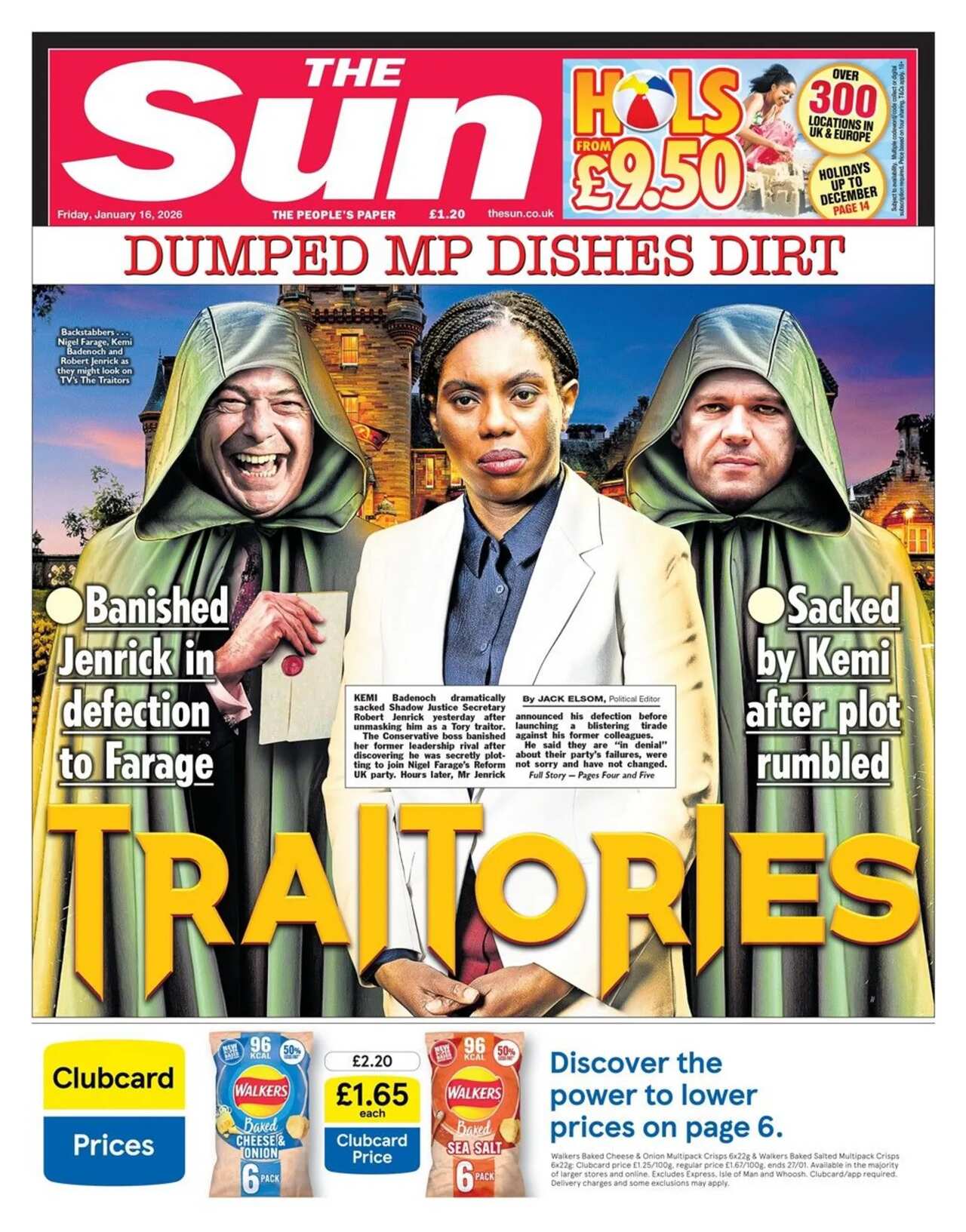 The Sun dramatically imagines Farage, Badenoch and "banished Jenrick" as part of the hugely popular TV show The Traitors, with the headline "Traitories" in front of the two men dressed in green cloaks. The paper describes Badenoch's actions as she "banished her former leadership rival".Similarly, the Metro reports that the "shock Tory defection echoes the drama on TV". An edited photo of Jenrick draped in a red clock as "the secret traitor" features on the paper's front page.Badenoch raises her glass on i Paper's front page on a "day of poison and betrayal" following the exiling of "her rival Jenrick". According to the paper, someone close to the former Conservative shadow minister revealed his plan of wanting to join Reform UK to the Tory leader.A smiling Jenrick shaking hands with an elated Nigel Farage is featured as the main image on the Independent. A "gloating Farage" thanks Badenoch for "jumping the gun" and delivering Robert Jenrick to Reform "on a plate", the paper reports.The Daily Mirror dubs Reform UK a "party of Tory failures" and asks "would you trust any of them?"Badenoch says "bad people are leaving my party" after the Tory leader sacked Jenrick, the Daily Express reports. The paper headlines on Jenrick's "blast at 'rotten Tories'".The Times reports on the former shadow justice secretary secretly negotiating with Farage "for four months" before he was sacked by Badenoch. The paper says the Conservative leader "pre-emptively dismissed" Jenrick after discovering "irrefutable evidence he was plotting to join Reform".Jenrick's declaration that his former party "broke Britain" makes the headline on the front of the Telegraph.The Daily Mail uses their front page to send a message to Reform and the Tories to "stop fighting each other" and "end the Labour nightmare".A "line of fire" of ICE agents in Minneapolis looms large at the top of the Financial Times.Nigel Farage being pranked into making a Cameo video is the focus of the Daily Star's front page.
