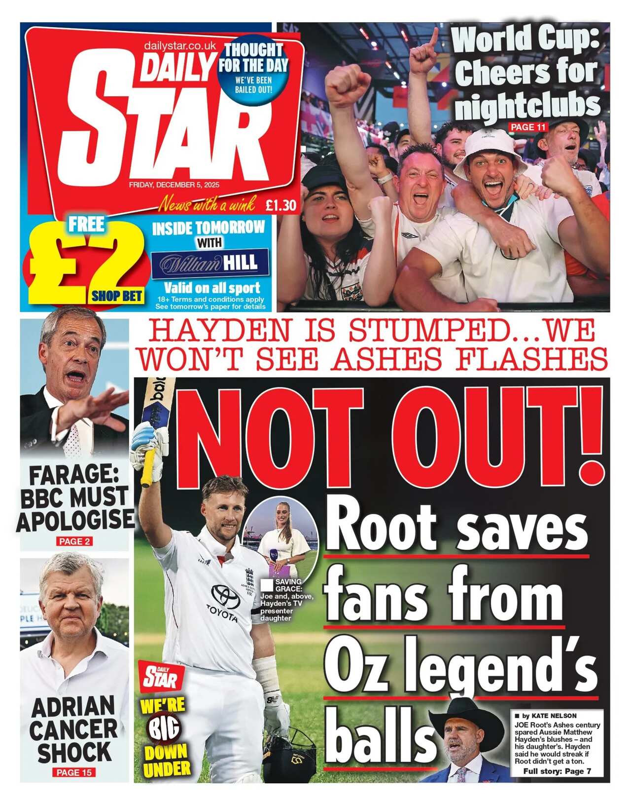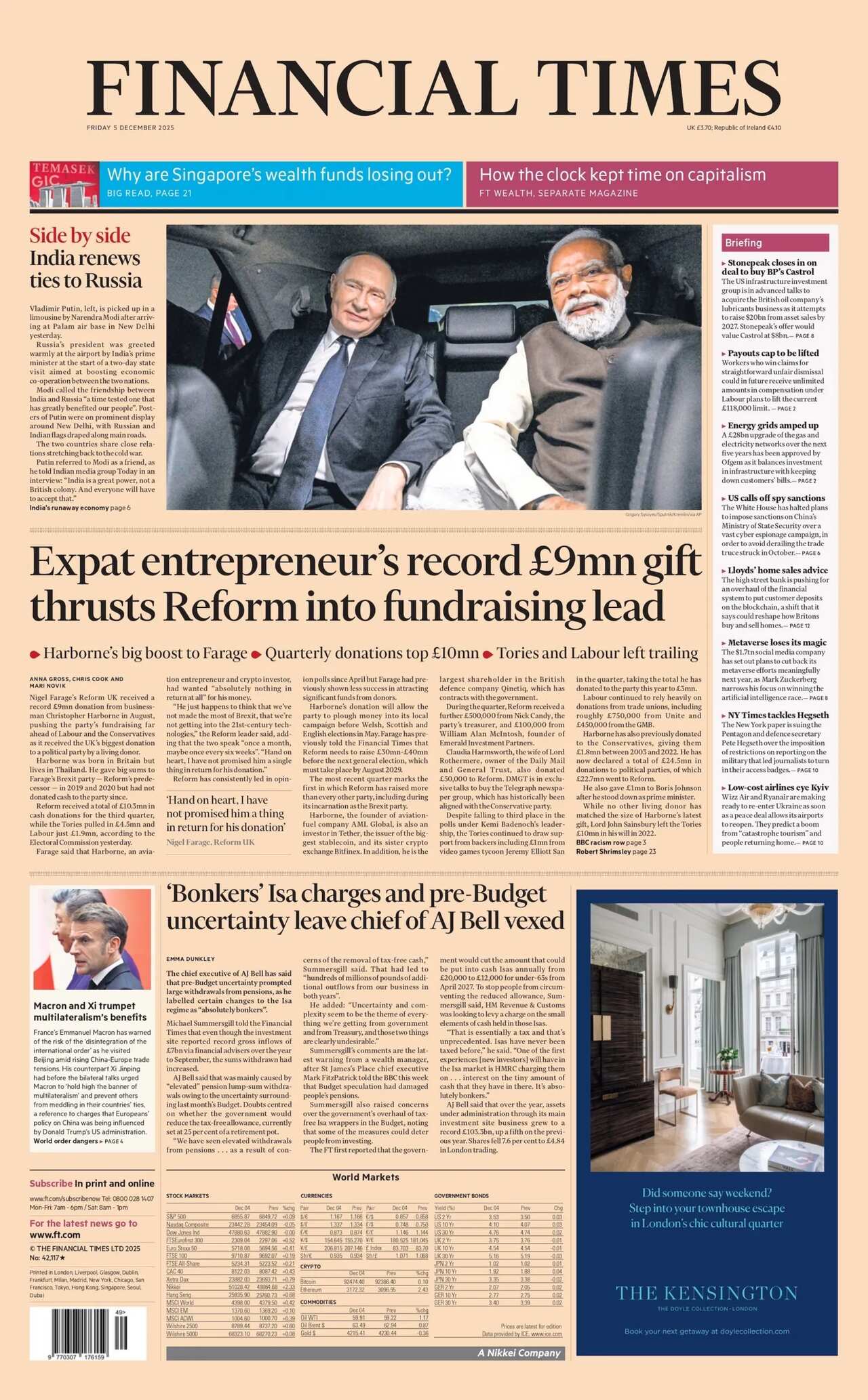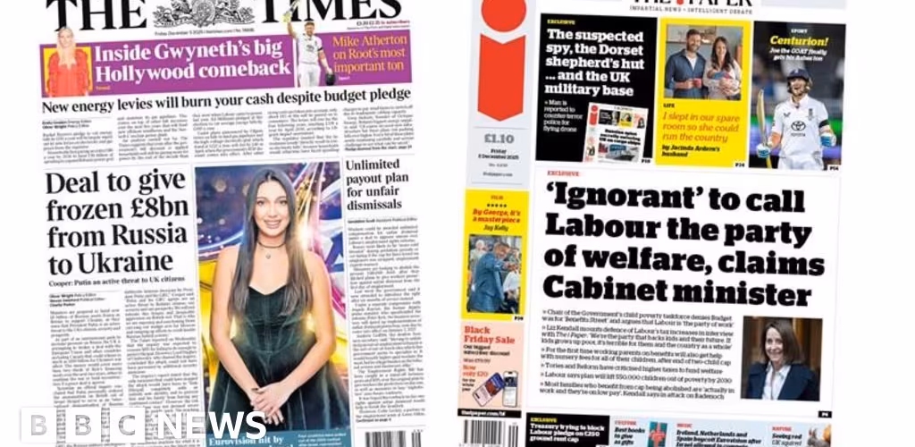 For the Daily Mail, "Farage's 'It Ain't Half Hot Mum' attack on BBC double standards" is in the lead. The Reform UK leader said the corporation should issue an apology for broadcasting the programme and others if it wanted to apply the standards of today to the 1970s.Reform UK have been thrust into the "fundraising lead" reports the Financial Times after an expat entrepreneur's record £9m gift. The paper also snaps Russian President Vladimir Putin in a car with Indian Prime Minister Narendra Modi as the pair met in New Delhi at the start of a two-day summit.Ex-Masterchef host John Torode is "in therapy over TV axe" reads the headline of the Sun. He says he is suffering from "grief" after being fired from the show when an allegation of racism against him was upheld. Torode has denied the allegations.There are "fears of worst flu wave to strike NHS this winter" says the Daily Express. Experts have urged people to get a jab, it adds. The paper also features a photo of England cricketer Joe Root who has scored a century in the Ashes. "Even Australia will have to admit he's a great now," it writes.The Daily Star also headlines on Joe Root's cricketing success with "not out" after he "saves fans from Oz legend's balls"."Dawn's blood on his hands" leads the Daily Mirror after an inquiry found Russian President Vladimir Putin to be "morally responsible" for the death of Dawn Sturgess. The "Russian tyrant ordered his assassins to attack" British agent Sergei Skripal writes the Mirror, before "recklessly" discarding the perfume bottle containing the poison that ultimately killed the mother-of-three in Salisbury.For the Daily Telegraph, David Lammy has broken "ranks" on Brexit as it says the deputy prime minister refused to rule out reversing the UK's withdrawal from the EU process seven times. The Telegraph dubs Putin and Modi "brothers in arms" sharing the same picture as the FT on its front.Calling Labour the "party of welfare" is "ignorant", Labour's Liz Kendall has said in an exclusive for the i Paper. The chair of the government's child poverty taskforce said "we're the party that backs kids and their future". The i dubs Joe Root "the GOAT" for "finally" getting his Ashes ton.Metro dubs the Lake District the "Quake District" after a 3.3 magnitude tremor left locals and tourists "quaking with fear".