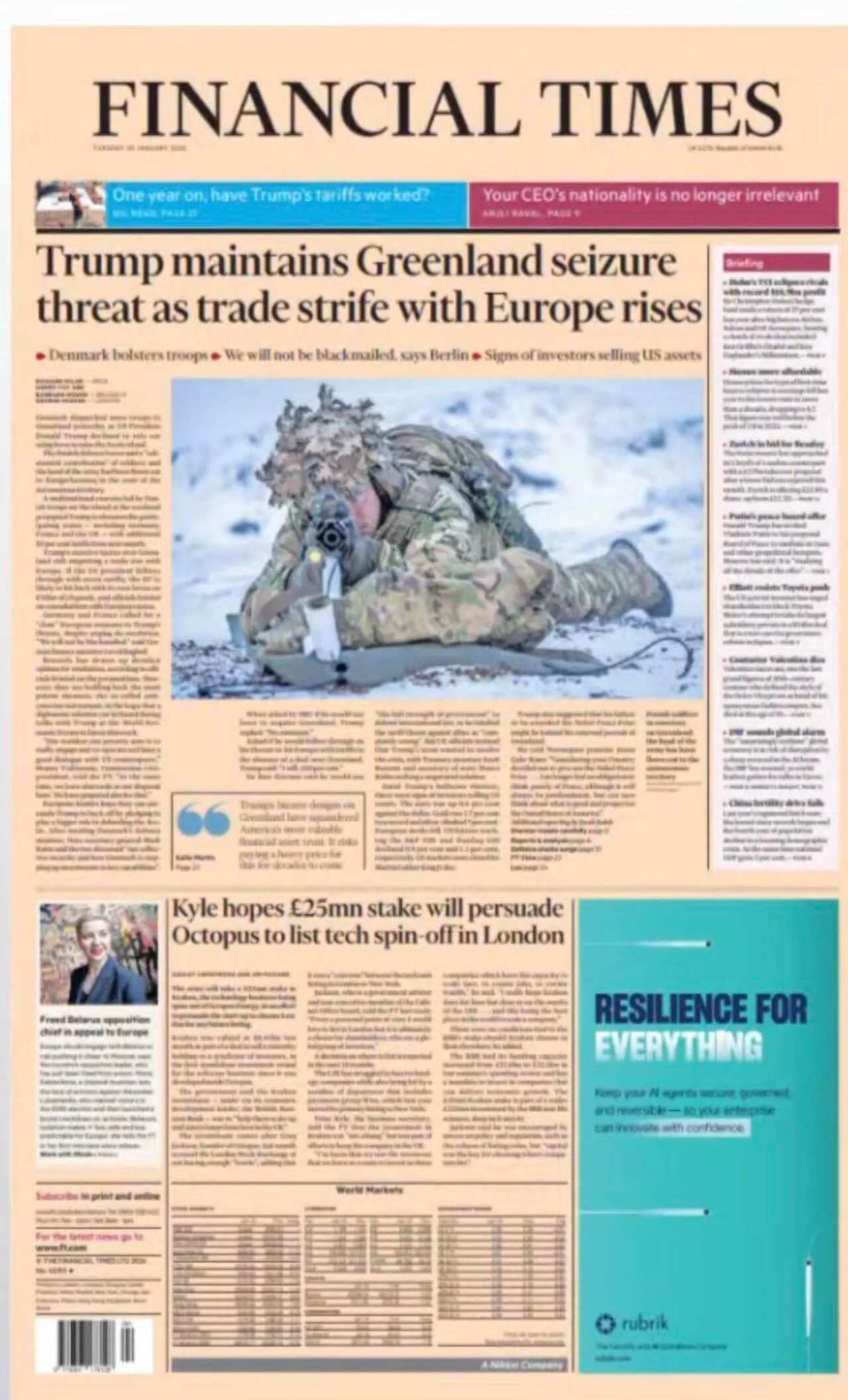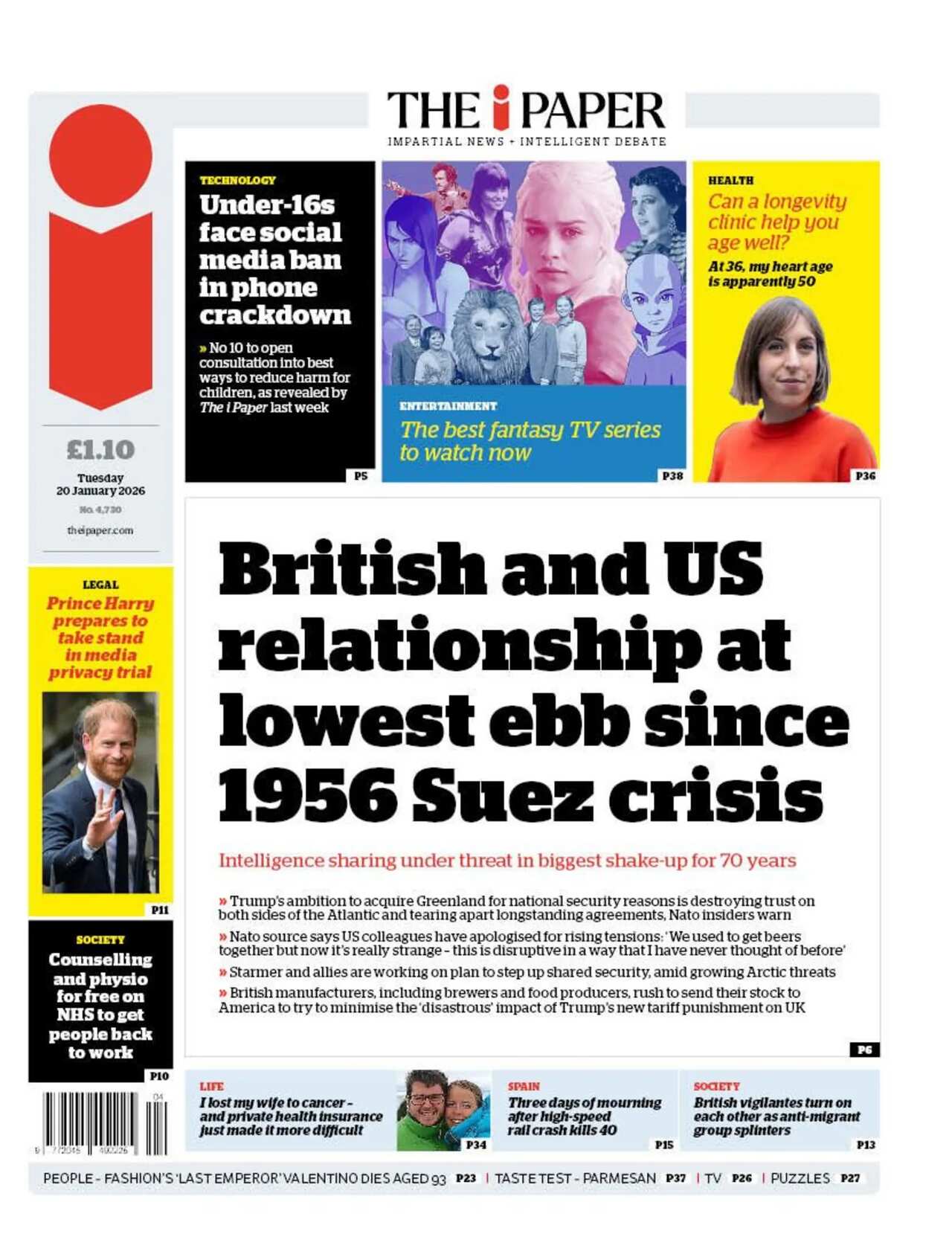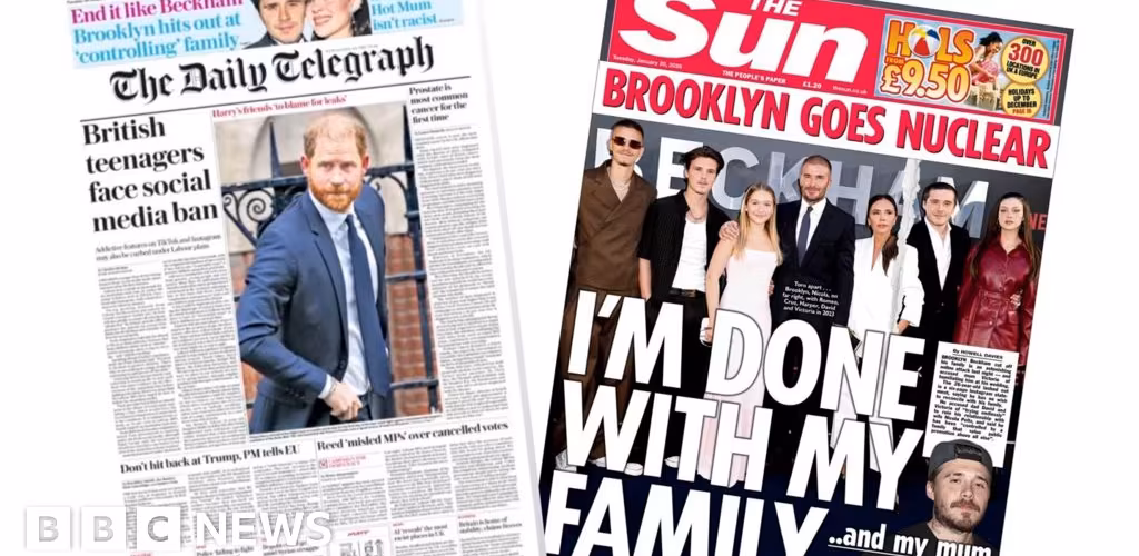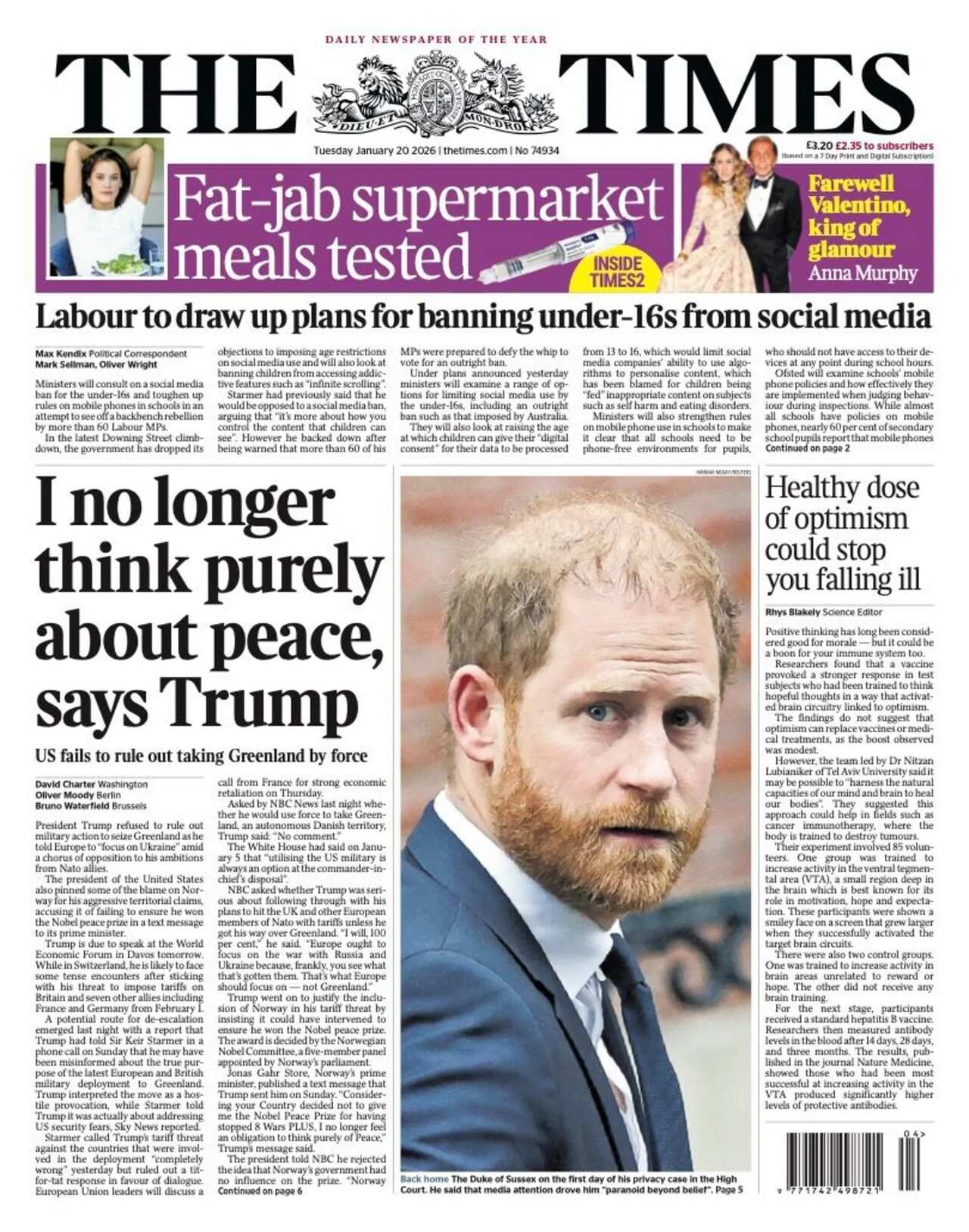 The Sun carries the same headline as the Mail, providing more details from the six-page Instagram statement from Peltz Beckham saying he has no wish to reconcile with his family."Brooklyn blasts Posh and Becks" is the Daily Star's take. Elsewhere, the paper pays tribute to legendary Italian fashion designer Valentino who has died aged 93.The i Paper reports that Nato insiders are warning that Donald Trump's ambition to annex Greenland is "destroying trust" and "tearing apart longstanding agreements". The headline suggests that UK and US relations is at its "lowest ebb" since the 1956 Suez crisis.Staying with Donald Trump, the Guardian reports the US president has linked his threats to seize control of Greenland to his failure to win the Nobel Peace Prize. In a text message sent to Norwegian prime minister Jonas Gahr Støre on Sunday, Trump said he no longer felt the need to think "purely of peace" after being snubbed for the award, the paper says. In the top picture spot is Prince Harry arriving at the Royal Courts of Justice in London for the trial against the Daily Mail for alleged unlawful information gathering.The Metro focuses on the response from Norway's prime minister, saying he has repeatedly tried to explain to Donald Trump that he was not purposely snubbed for the award. "A prize idiot" is the headline.The Times follows with reports that Trump has refused to rule out military action to seize Greenland despite intense opposition from European allies. The US leader is due to speak at the World Economic Forum in Davos on Wednesday where the paper says he is likely to face some "tense encounters" with Nato allies."Trump maintains Greenland seizure threat" echoes the Financial Times. It features responses from Nato allies, with Denmark bolstering its military troops and Germany saying "we will not be blackmailed".In news closer to home, the Daily Telegraph's lead story reports the government confirmation that it is consulting on plans for an Australian-style social media ban for teenagers under 16 in the UK. The paper says the final decision is expected to be made in the summer. The story also gets a mention on a number of other front pages.Finally, the Daily Express fills its front page with a photo of four nurses, who have spoken to the paper after they complained about a transgender woman using their changing room at a hospital - leading to an employment tribunal ruling in their favour.